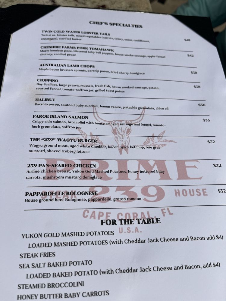 Prime 239, a trendy and upscale steakhouse in Cape Coral, FL, offers a vibrant atmosphere and exceptional service. Known for their perfectly cooked steaks and delicious sides like jalapeno creamed corn and maple bacon brussel sprouts, Prime 239 has left customers raving about the flavors and quality of their dishes. The menu also features options like stuffed flounder with mushroom risotto and mouthwatering desserts like crème brûlée. Diners appreciate the attention to detail in the service and the wide selection of drinks at the full bar. With a focus on sustainability through plastic-free packaging and being women-owned, Prime 239 sets itself apart as a unique dining experience. Whether it's a special occasion or a casual night out, Prime 239 promises a memorable culinary adventure.